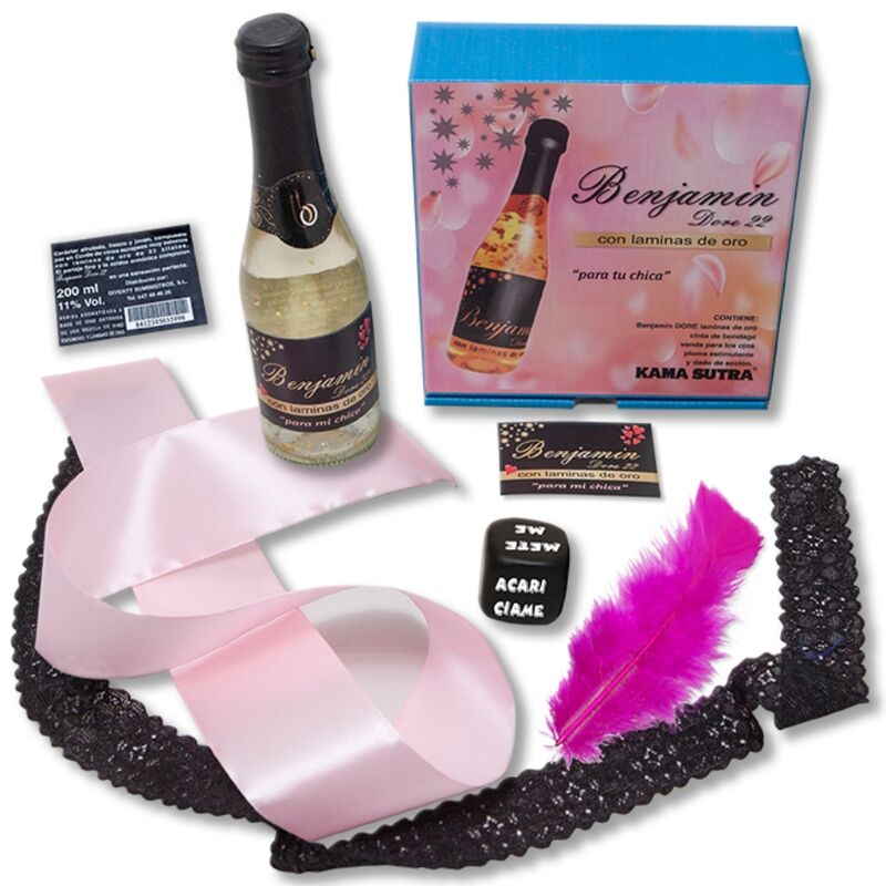 ESTUCHE con un BENJAMIN DORE CON LAMINAS DE ORO DE 22 KILATES de carácter afrutado, fresco y joven, compuesto por un vino espumoso muy selecto CON LAMINAS DE ORO de 22 KILATES PARA TU CHICO.
