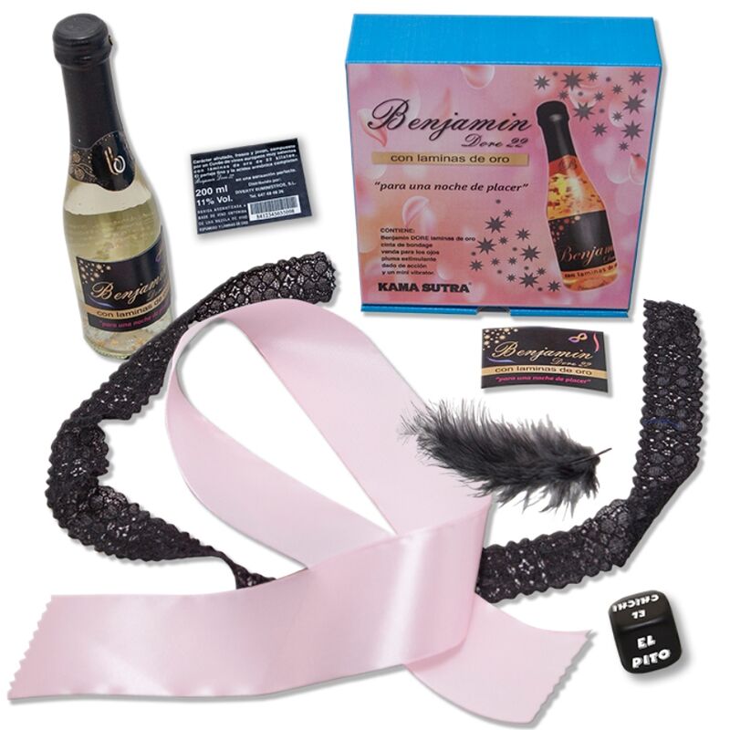 ESTUCHE con un BENJAMIN DORE CON LAMINAS DE ORO DE 22 KILATES de carácter afrutado, fresco y joven, compuesto por un vino espumoso muy selecto CON LAMINAS DE ORO de 22 KILATES PARA UNA NOCHE DE PLACER.